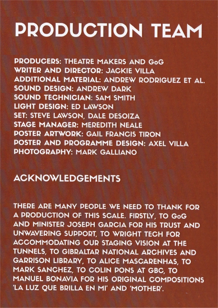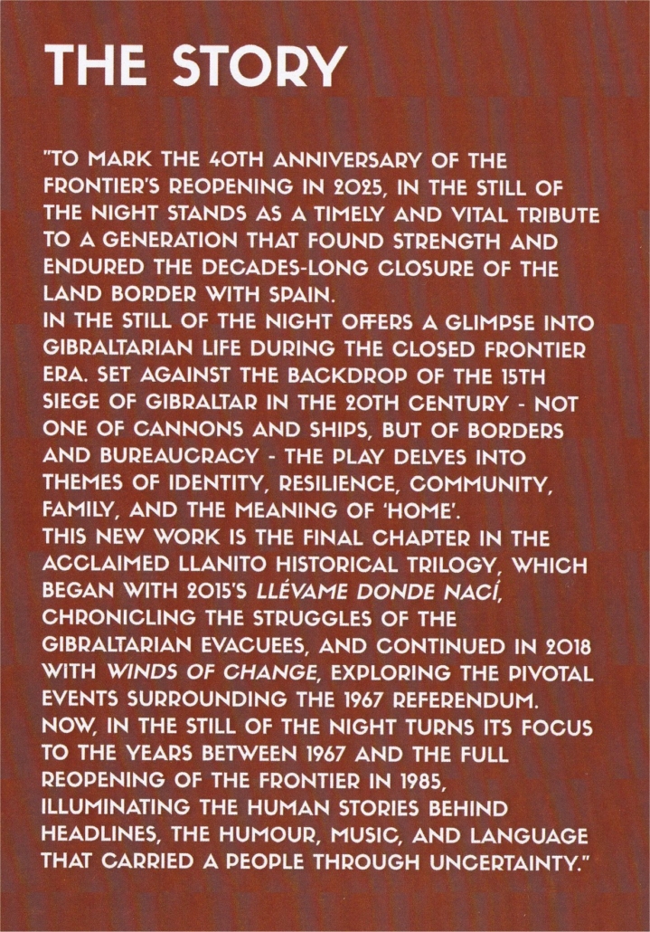 It has been almost a decade since Jackie Villa and I began to collaborate on what was to become a trilogy of historical plays concerning the lives of Gibraltarians. The first was ‘Llévame donde Nací’ about the forced evacuation of the populace during the second world war. The second was ‘The Winds of Change’ concerning the story of Gibraltar’s 1967 Referendum. Then came ‘In the Still of the Night’ a third and final chapter, covering the years when Franco slammed the frontier shut. Three distinct moments which helped create the nation and the people we have become. Each having its own flavour, style and period in which they lived and breathed. These projects have always been very much Jackie’s with her asking me along for the ride. Something, I have been thankful for…. by the end of it. For these are enormous tales to tell and are not for the faint of heart. LOL!
